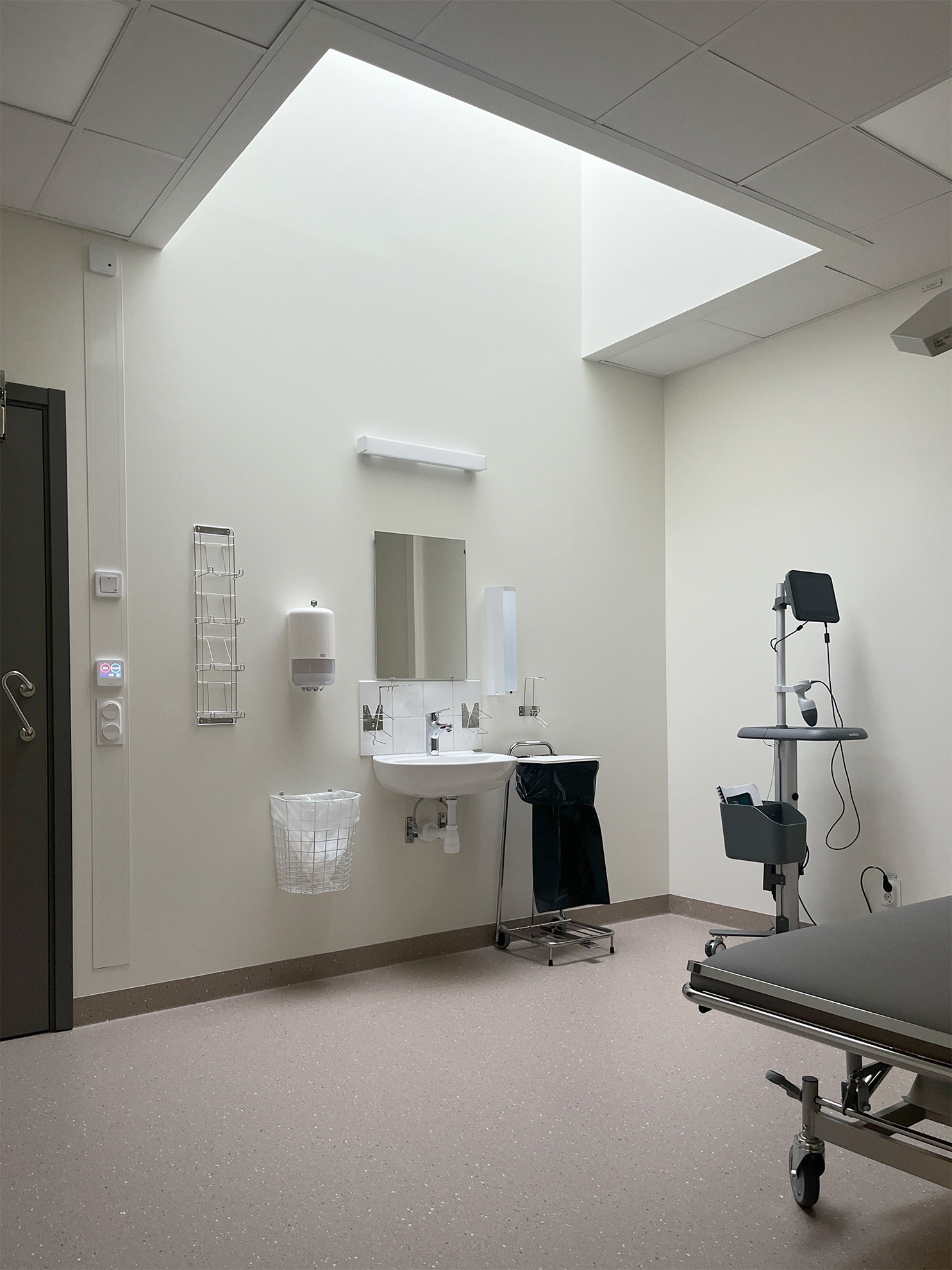 Verksamheterna är strategiskt placerade runt en central innergård och kan med hjälp av flexibla gränser anpassas efter behov. Gemensamma områden som personalutrymmen och konferenslokaler delas för att främja samarbete över avdelningsgränserna och skapa en gynnsam arbetsmiljö. Den rymliga, ljusa och inbjudande huvudentrén fungerar som navet som knyter samman byggnadens olika delar.
